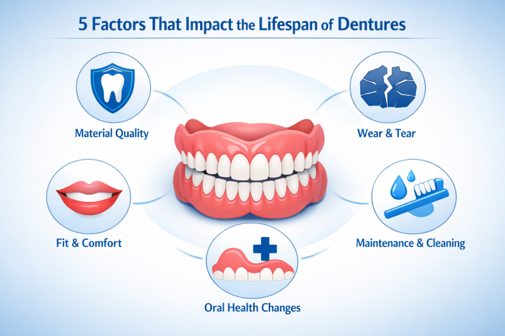 Dentures typically last 5-10 years, but factors like wear and tear, changes in fit, and your oral health can affect their lifespan. Regular checkups with your dentist will help determine when replacements or adjustments are needed.